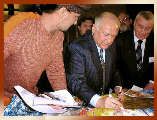 Виктор Черномырдин расписывается на шелкографии "Стена" Исмета Шейх-Задэ