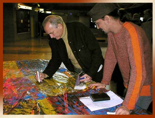 На шелкографии Исмета "Стена" расписывается Василий Лановой